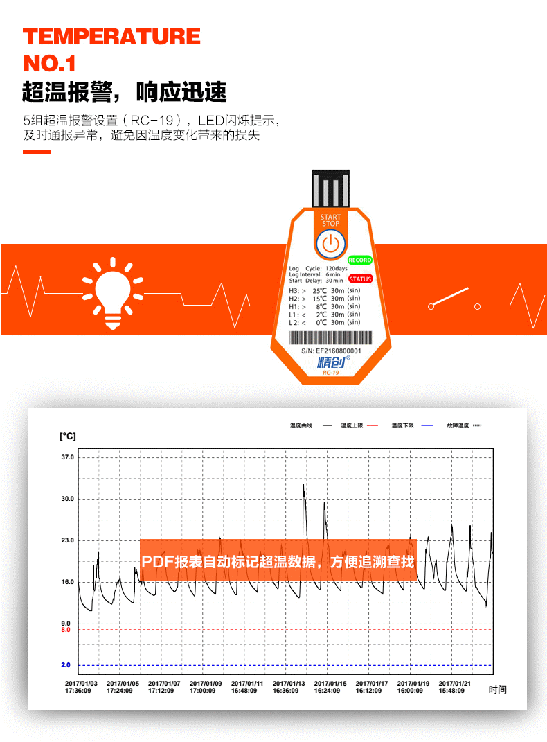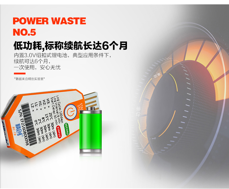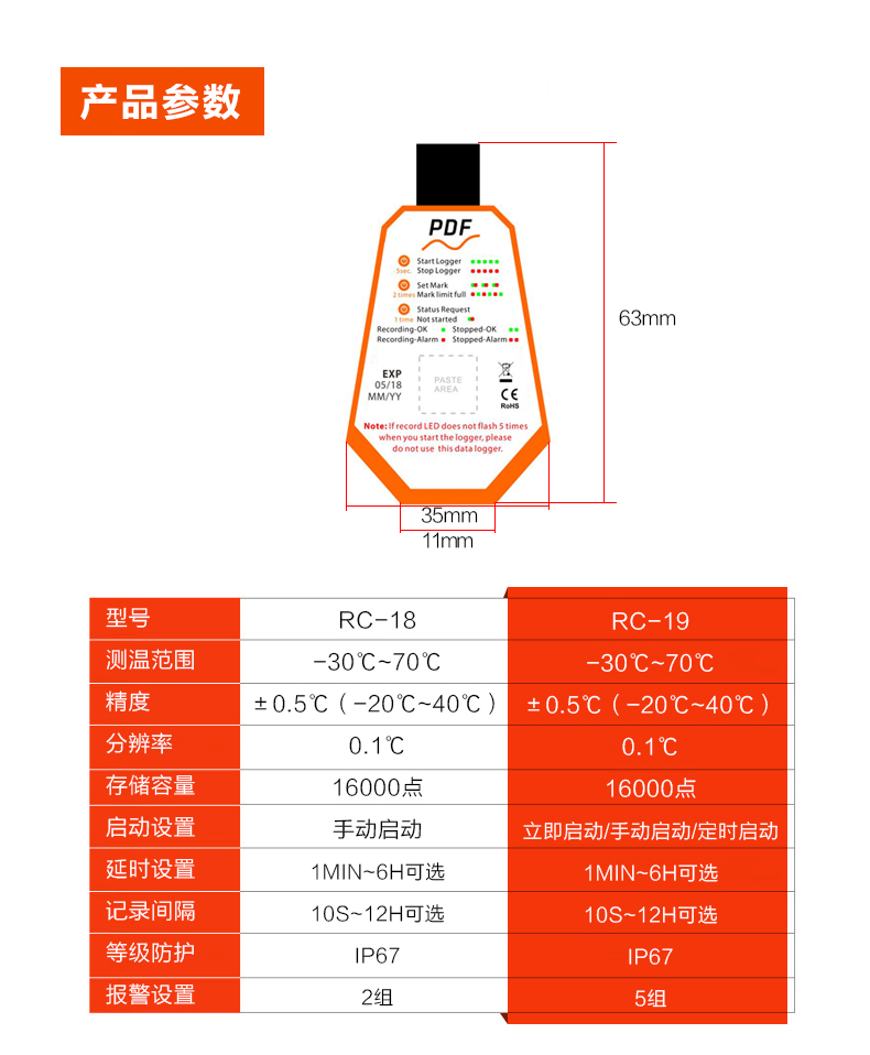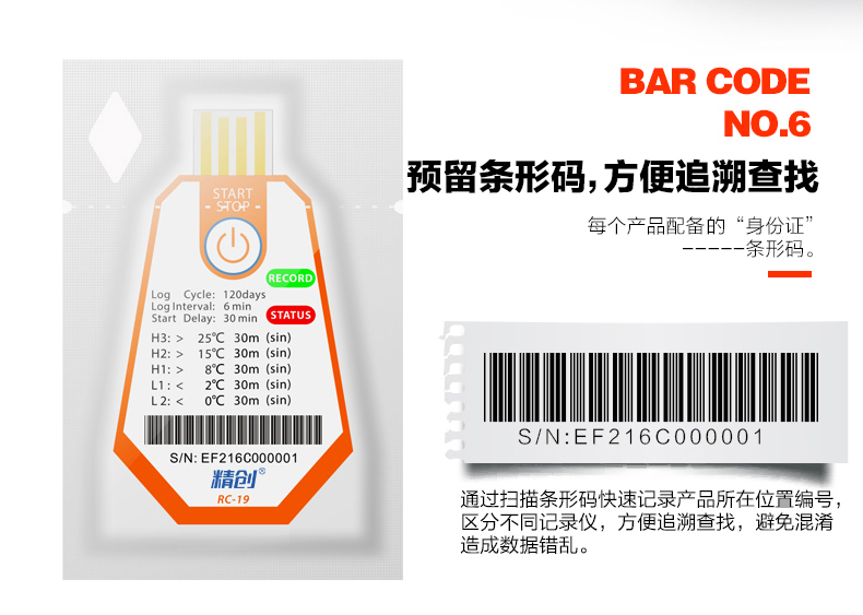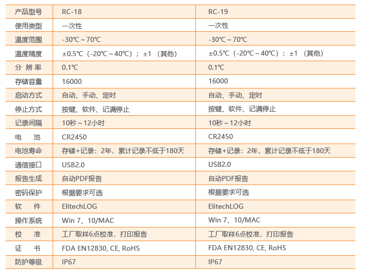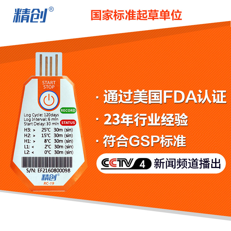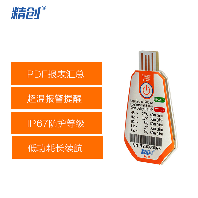 精創(chuàng)溫度記錄儀RC-18/19 溫度記錄儀主要用于食品及藥品儲運(yùn)環(huán)境的溫度監(jiān)測記錄,通過USB 的方式連接電腦,記錄數(shù)據(jù)直接以PDF 報(bào)告輸出;溫度探頭內(nèi)置,采用CR2450 寬溫鋰電池供電,防水等級達(dá)到IP67。產(chǎn)品配有條形碼。